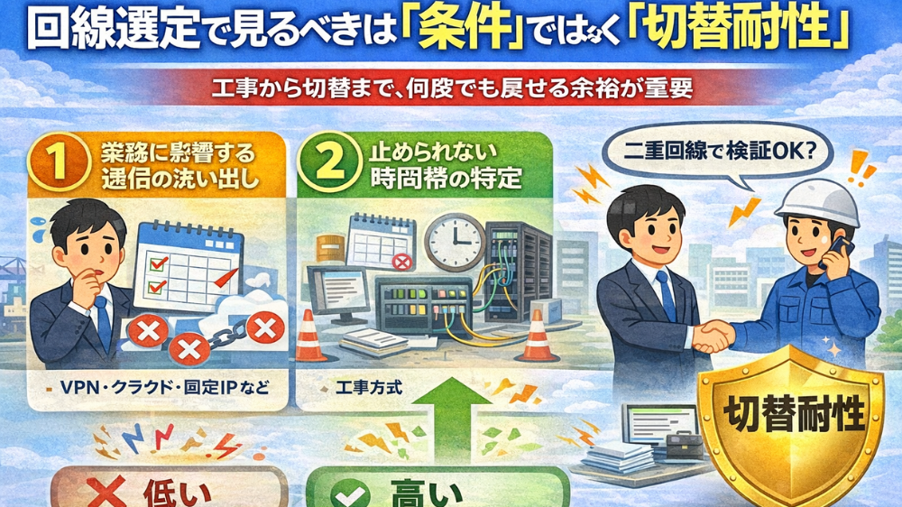 切替耐性とは、工事から本番切替までの間に発生する不確定要素に、どれだけ柔軟に対応できるかという考え方です。この視点を持つことで、回線選定の基準は大きく変わります。