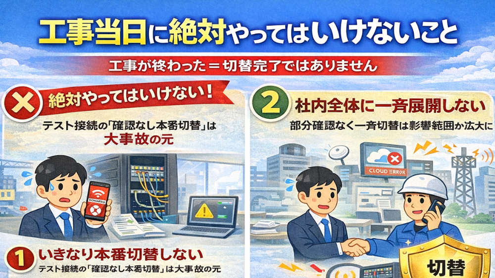 ここでの判断ミスは、そのまま業務停止につながります。重要なのは、「工事が終わった=切替完了」ではないという認識を、関係者全員で共有しておくことです。