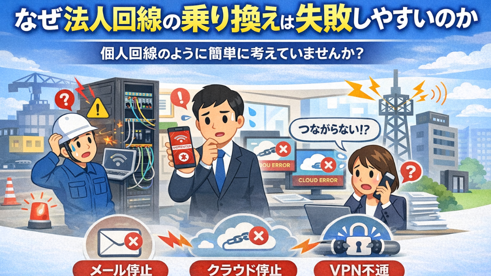 特に情シス専任者がいない中小企業では、乗り換え作業が通常業務の合間に処理されることが多く、「大きなトラブルにはならないだろう」という前提で進められがちです。しかし、この認識こそが、法人回線の乗り換えを失敗に導く出発点になります。