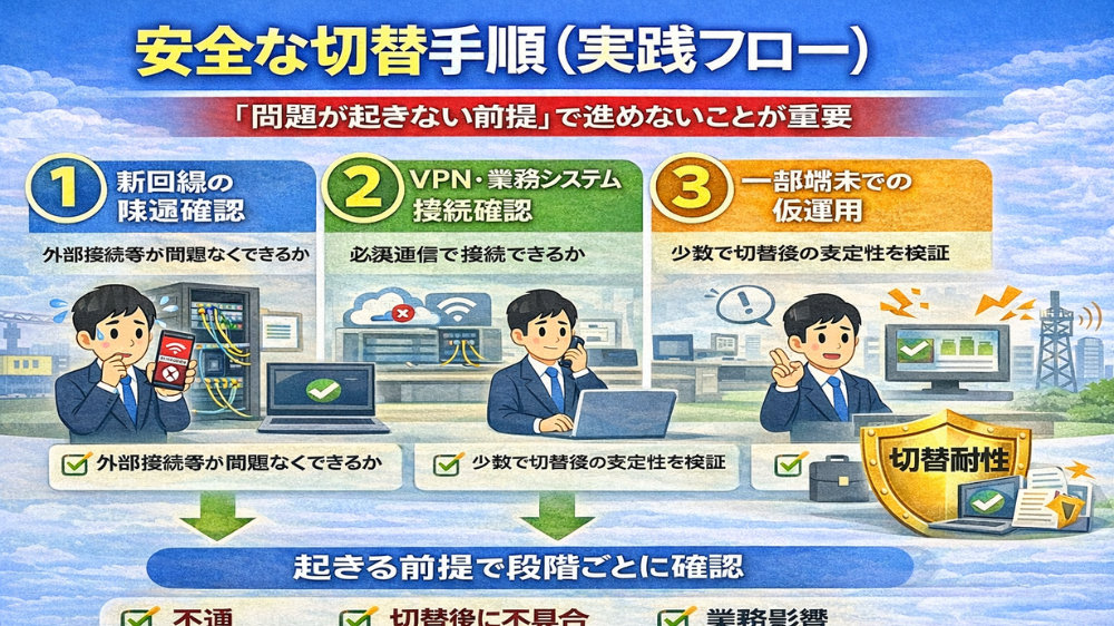 法人回線の切替を安全に行うためには、「問題が起きない前提」で進めるのではなく、問題が起きることを前提に段階的に確認する必要があります。