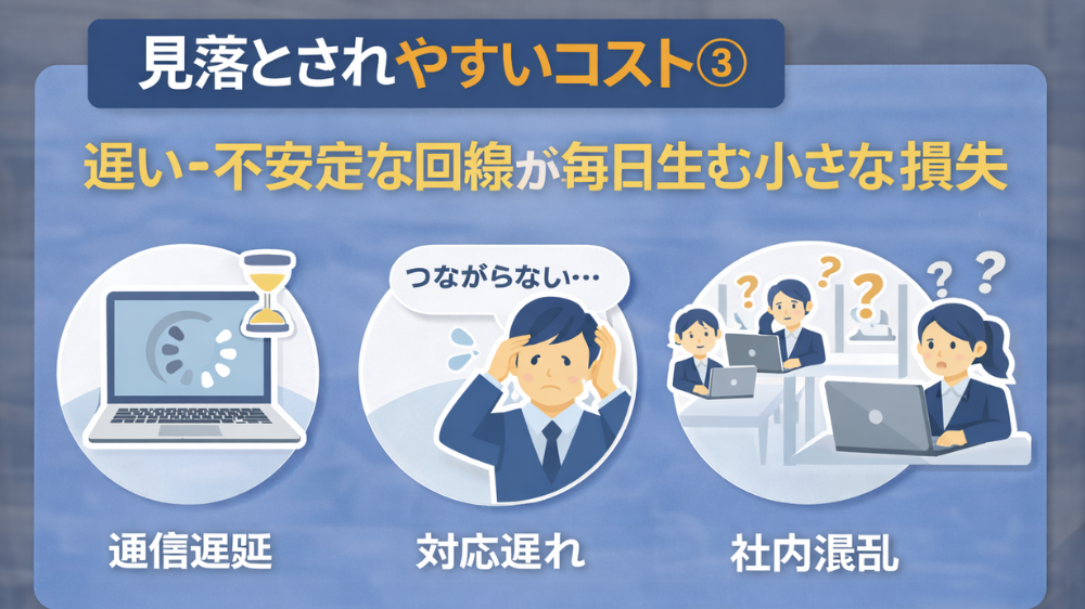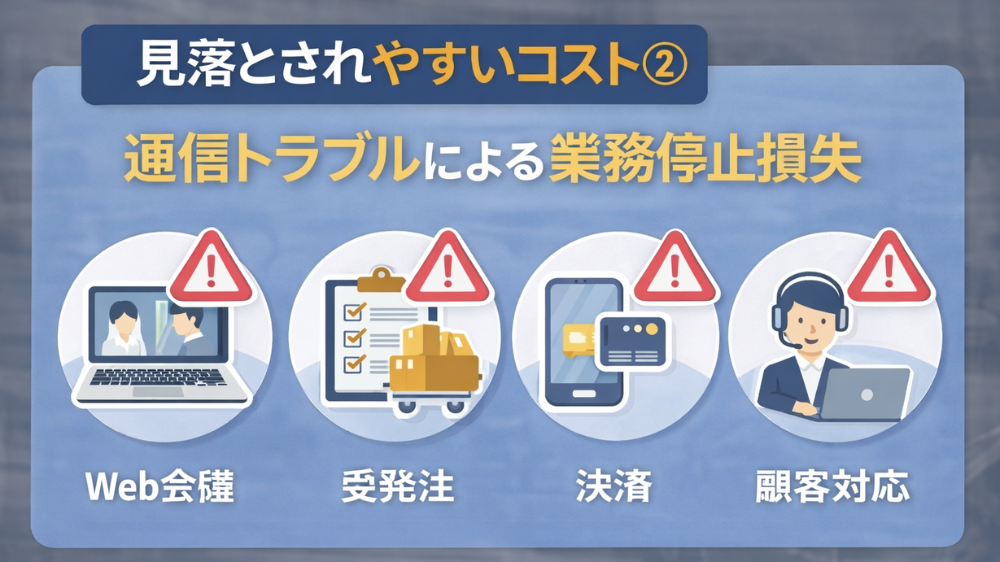 さらに、回線停止や不安定な通信によって、Web会議、クラウド、受発注、決済、VPNなどの業務が止まれば、その影響は月額差よりはるかに大きくなります。