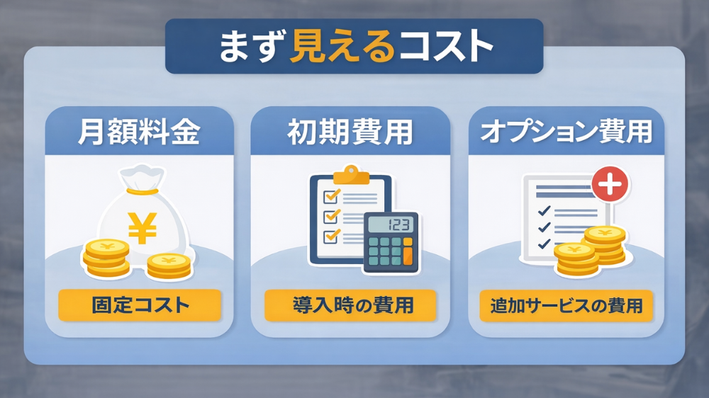 見えるコストの比較では、基本料金だけでなく、こうした追加費用まで含めた状態で「自社に必要な構成だと合計いくらになるか」を見ることが大切です。
