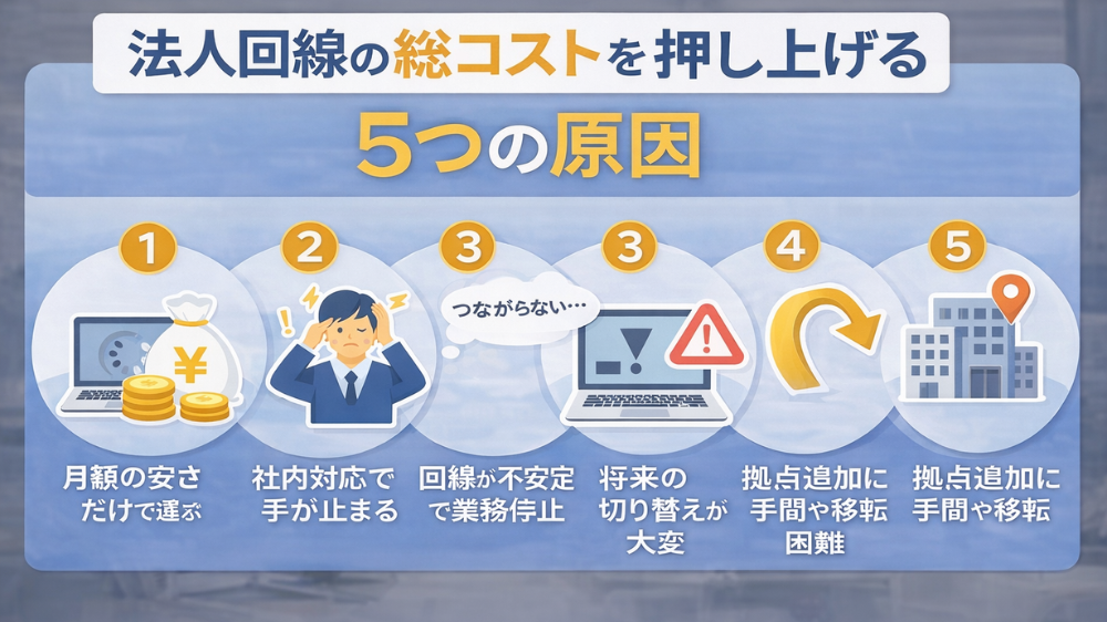 そこで本記事では、法人回線の総コストを、月額費用・初期費用・社内工数・停止損失・将来の切り替えコストまで含めて整理します。