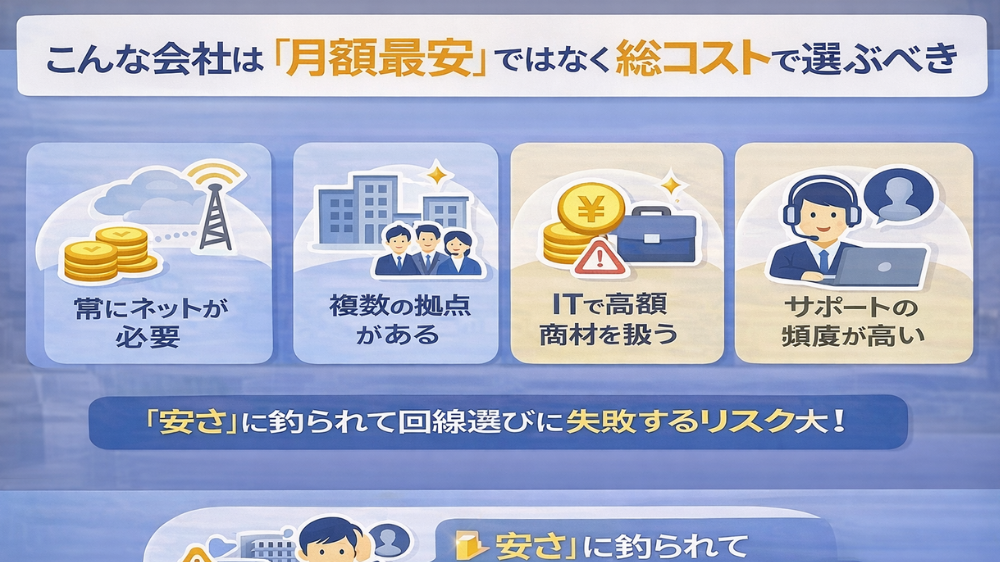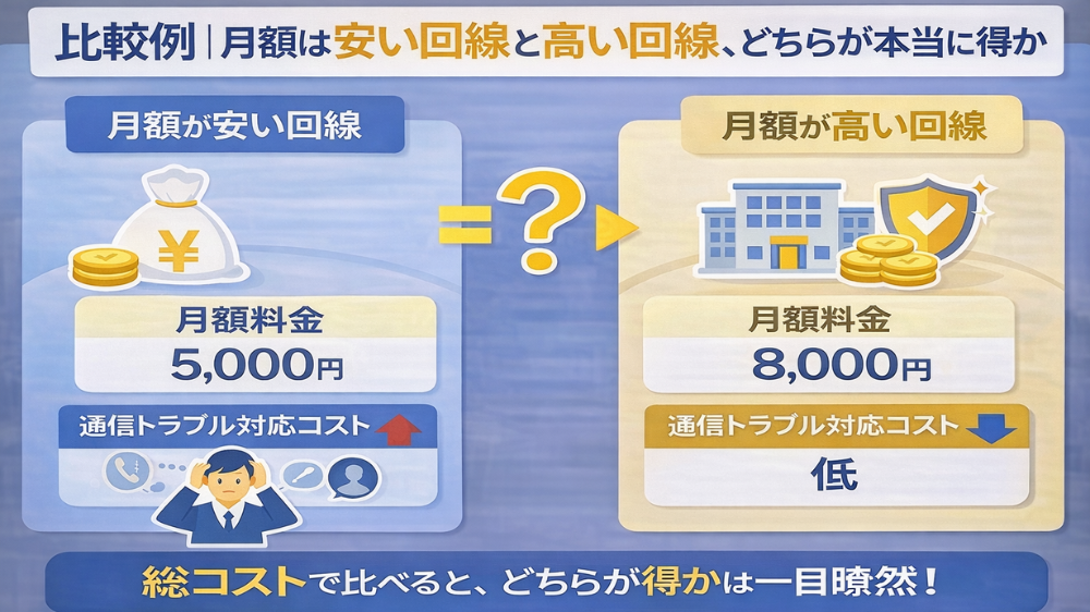 たとえば、月額が高くてもトラブルが少なく、社内対応が減り、業務停止リスクが下がる回線であれば、結果的に総コストは下がります。