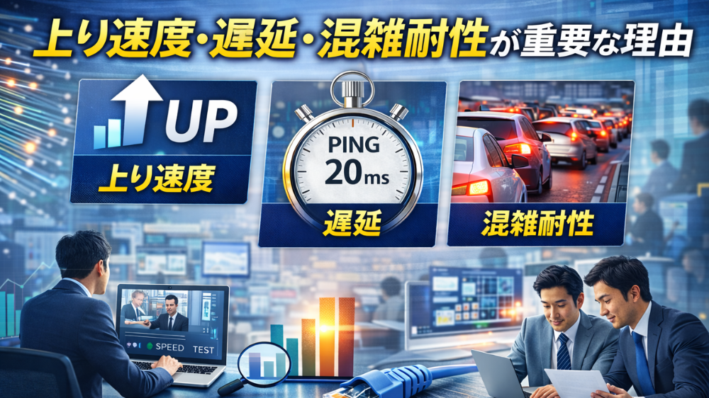 上り速度、遅延、混雑耐性のどれかが弱いと、業務全体が重くなります。