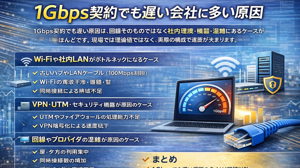 1Gbps契約でも遅い原因は、回線そのものではなく、社内環境・機器・混雑にあるケースがほとんどです。現場では理論値ではなく、実際の構成で速度が決まります。