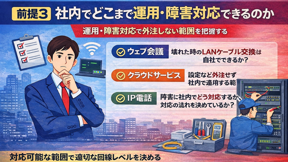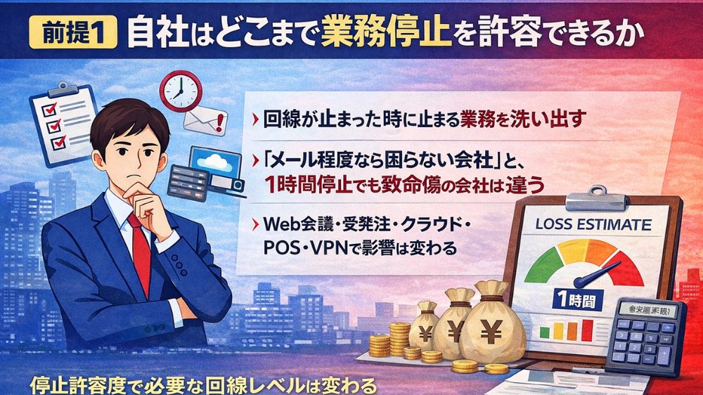 どこまで業務停止を許容できるか、どんな通信を使うのか、どこまで社内で運用できるのか。この3つを整理するだけで、回線選びの軸はかなり明確になります。