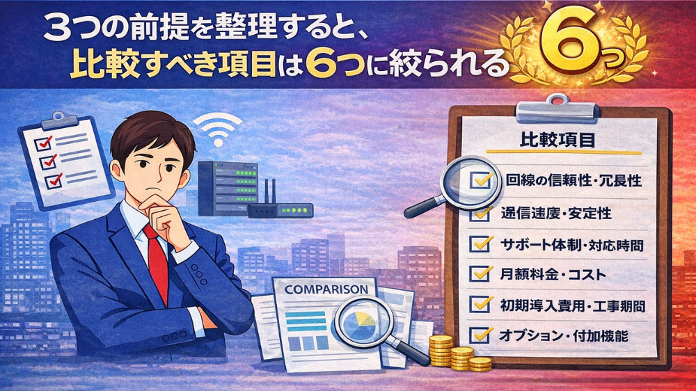 比較軸をもう一度整理しながら全体像を確認したい方は、法人向けインターネット回線の比較軸まとめもあわせてご覧ください。