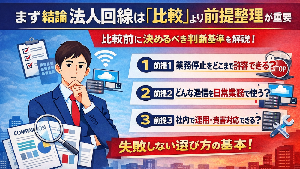 本記事では、法人回線を比較する前に必ず整理しておきたい3つの前提をわかりやすく解説します。