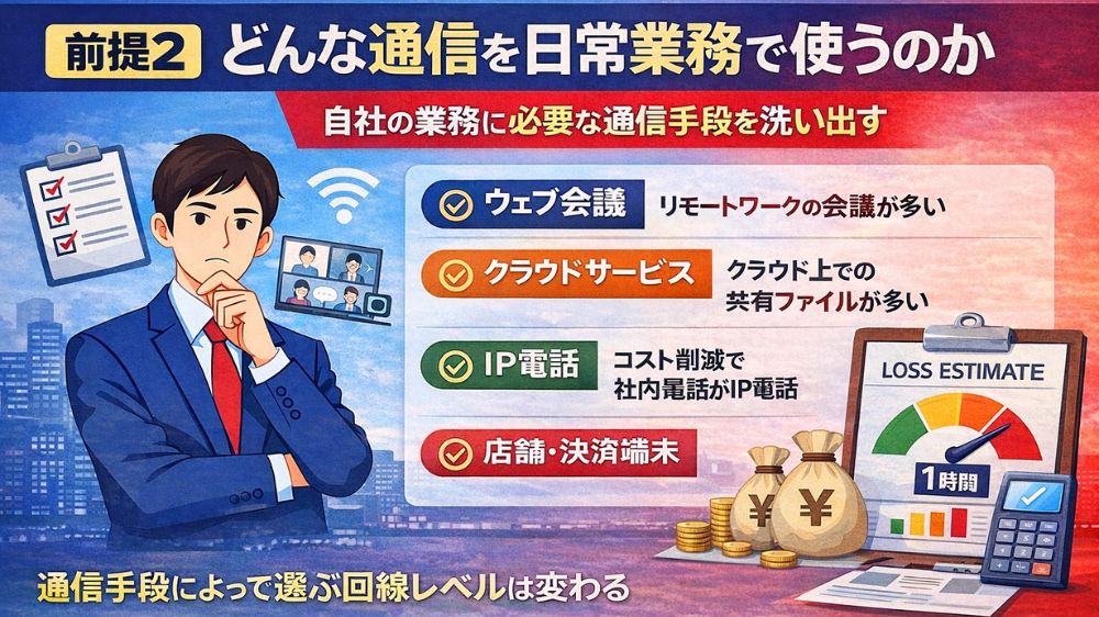 受発注、会議、予約、決済、VPN、クラウドなど、通信停止で止まる業務を具体的に洗い出します。ここが回線レベルの判断に直結します。